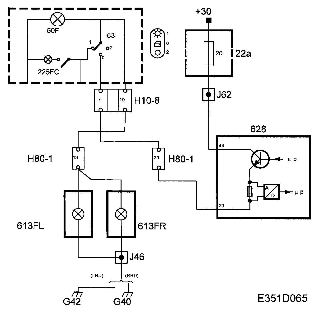 With the light switch in position 1, +30 voltage will be applied to DICE pin 24 via fuse 8. +30 is fed from DICE pin 70 to the floor lights (613FL and 613FR).