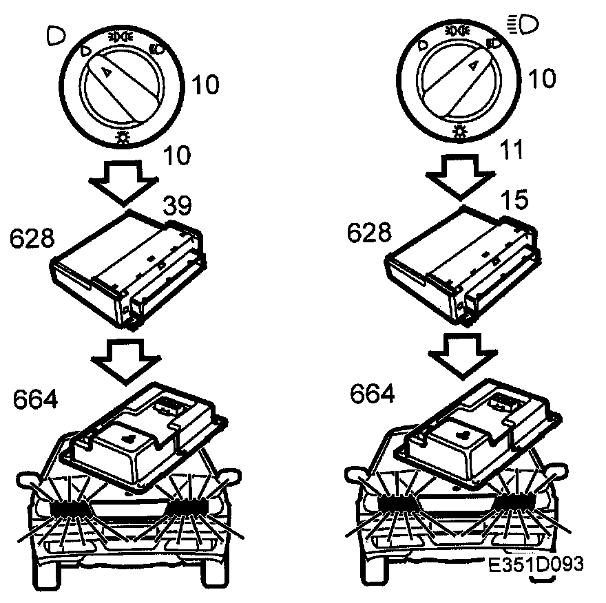 The main lights come on with the light switch (10) in position 2 and the ignition turned to OFF, ON or ST. Main or dipped beam is selected with the dipswitch (215) on the stalk to the left of the steering wheel. The dipswitch controls the main beam in 2 different ways: