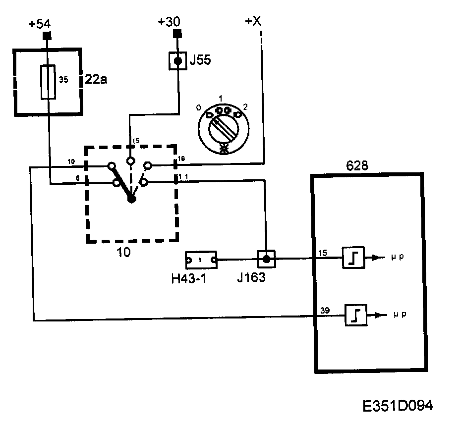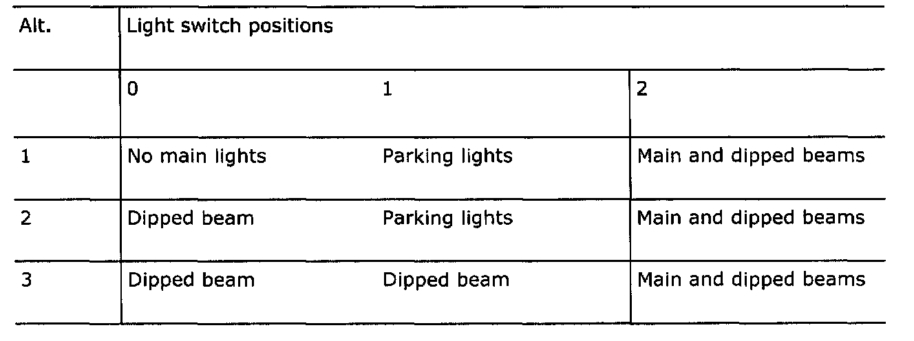 The light switch positions operate different lighting modes depending on how DICE is programmed. There are 3 different program alternatives. The reason for this is that different markets demand different lighting modes. When program alternative 1 is to be used, fuse 35 must first be removed.