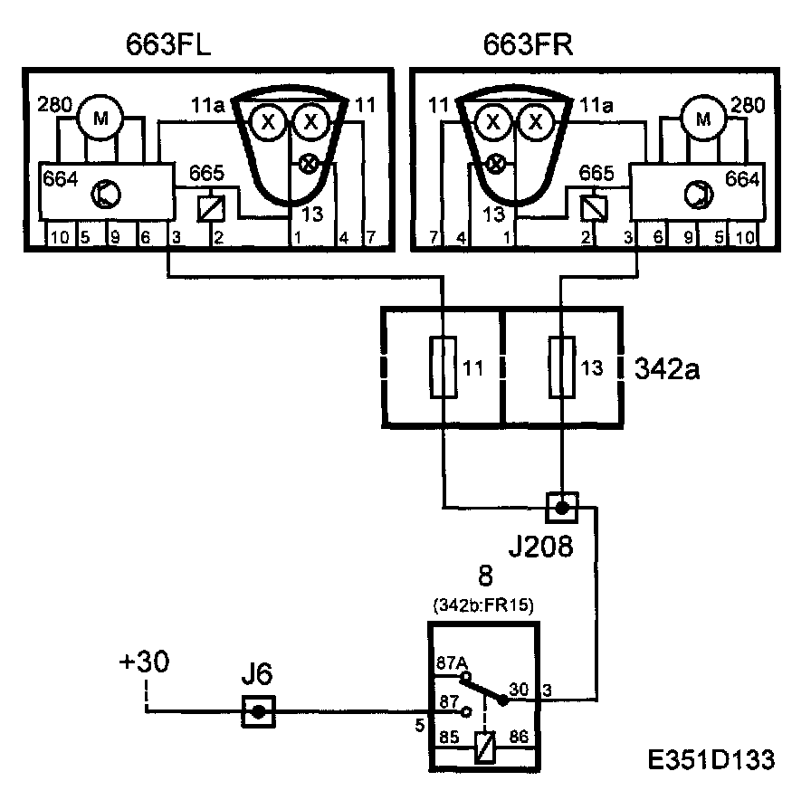 From relay (8) via fuse 13 in engine bay fuse box to headlamp, pin 3.