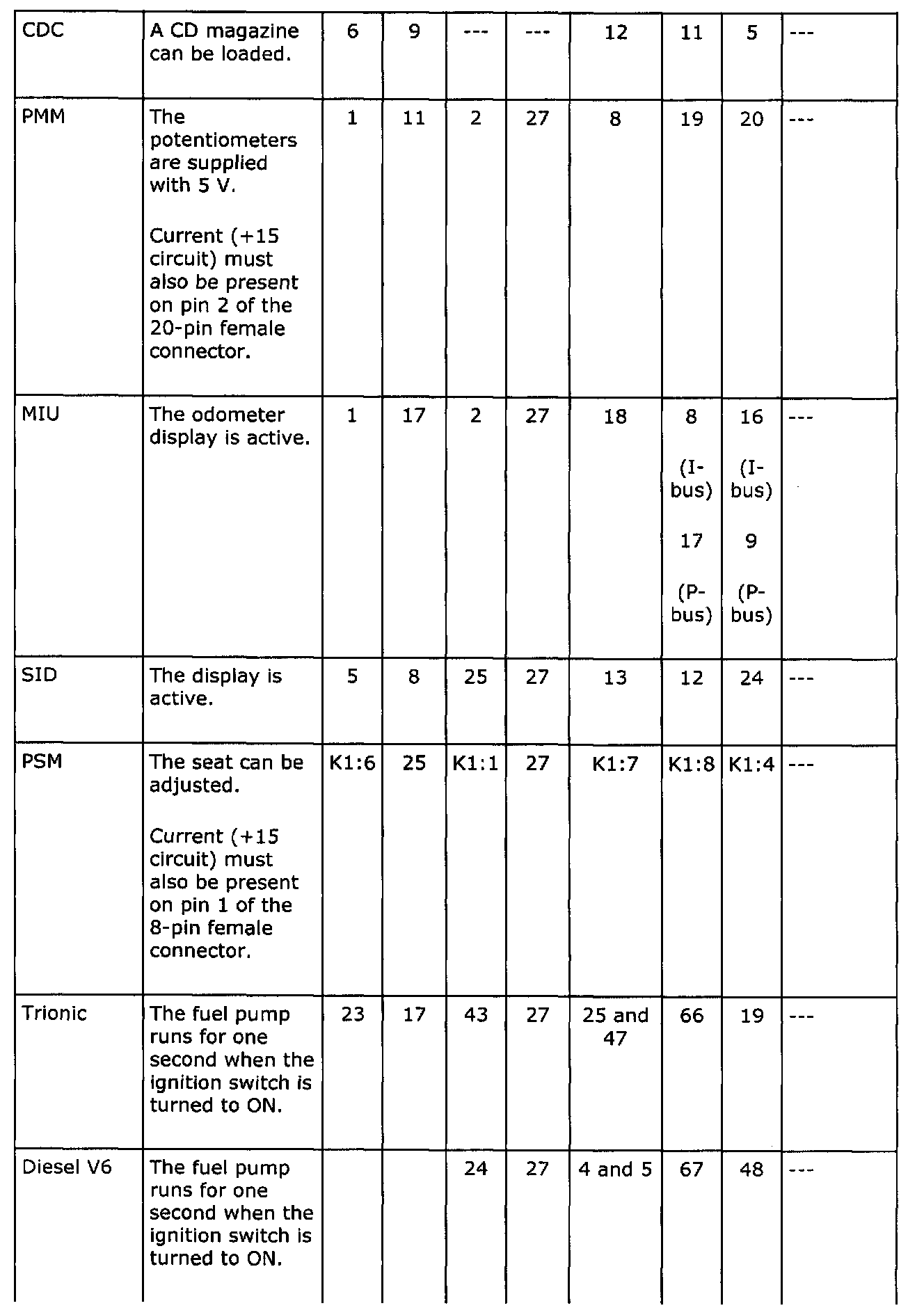 A simple means of checking whether the control modules are operative and allow diagnostics communication (column B) is given for each control module (column A) in the table below.