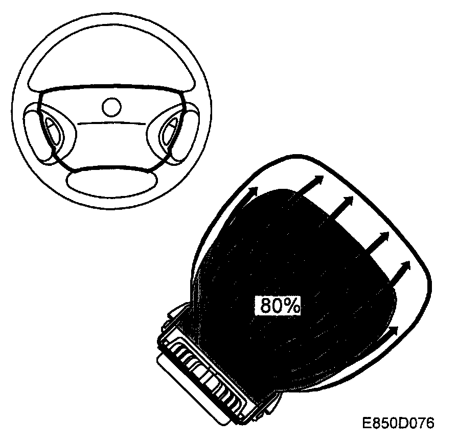 On the driver's side, there is a gas generator and an airbag. The gas generator is secured in a magnesium housing. The airbag is protected by a plastic cover with fracture lines mounted to the metal bracket. The airbag has a volume of approx. 58 litres.