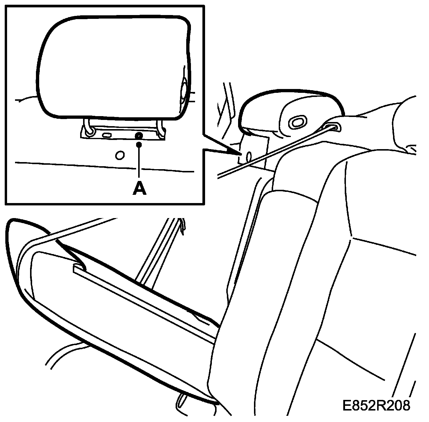 2. Remove the plastic cover and remove the head restraint, 1 screw (A).