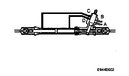 The valve housing, which is part of the rack housing, has four hydraulic connections for the flow of power steering fluid: Servo delivery from the power steering pump (A), return to the power steering fluid reservoir (B), to the servo cylinder when turning right or from the servo cylinder when turning left (C) and to the servo cylinder when turning left or from the servo cylinder when turning right (D).
