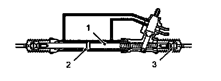 The cylinder is part of the rack housing. The rack (1) is equipped with a piston (2) complete with seals. For the flow of power steering fluid to and from the control valve there are two connections on the servo cylinder, one on each side of the piston. For turning right, power steering fluid is pumped to the right-hand section of the servo cylinder.
