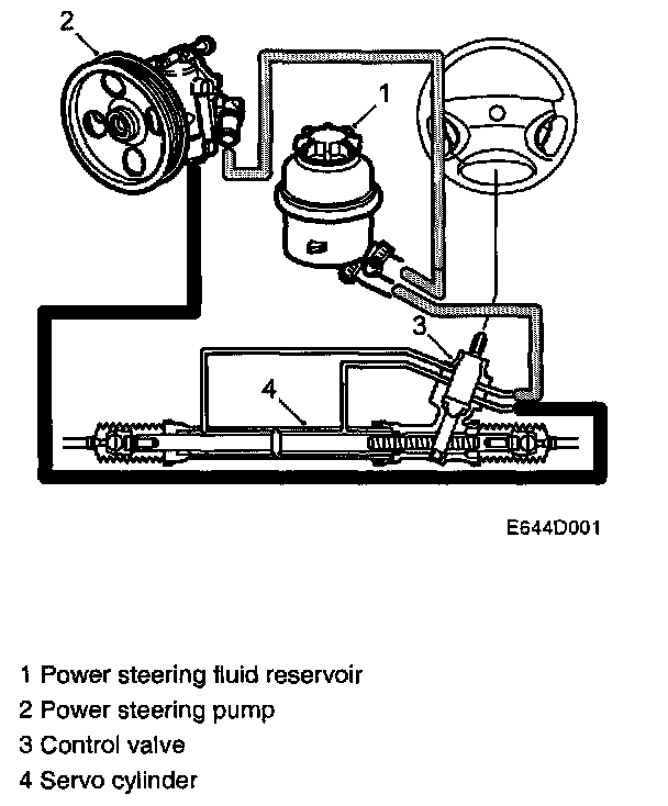 Power steering fluid is pumped from the power steering pump to the control valve where, depending on which way the steering wheel is turned, it is directed to either the right or the left side of the servo cylinder. The steering servo fluid inside the cylinder acts on the rack's piston, thus providing power assistance to the rack-and-pinion steering gear.