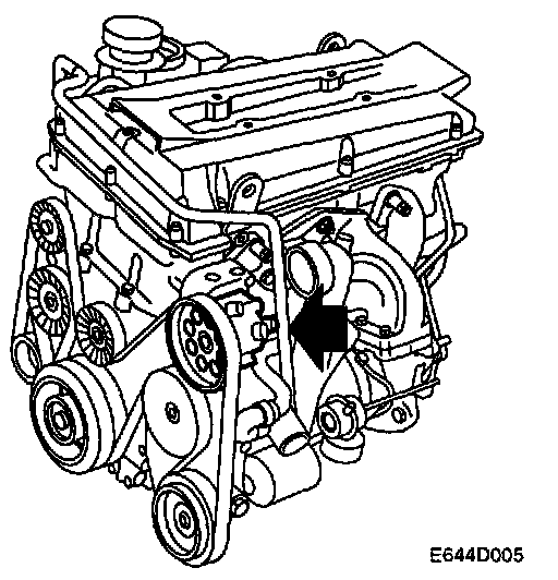 The power steering pump is driven by a multigroove V-belt from the crankshaft pulley.