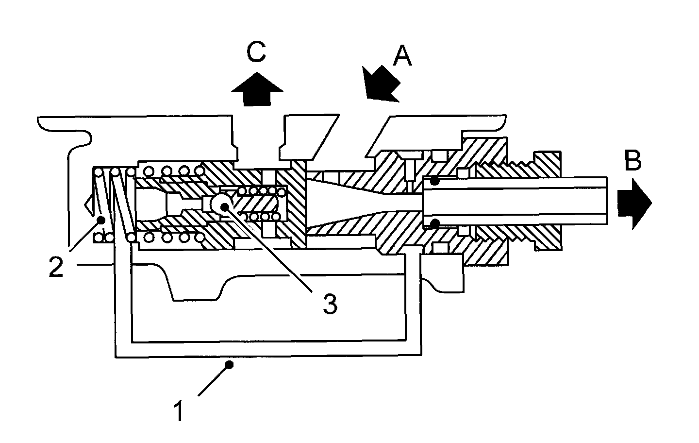 One side of the control valve is in direct contact with the delivery side of the pump (A). The outlet (B) from the pump incorporates a restriction from which a connecting line (1) leads to the other side of the valve, which is fitted with a spring (2). When not actuated, the valve is pressed against the outlet side.