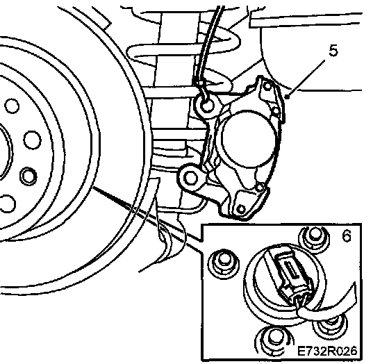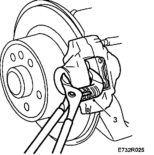 5. Undo the two brake caliper retaining bolts. Hang up the brake caliper by means of a cable tie.
