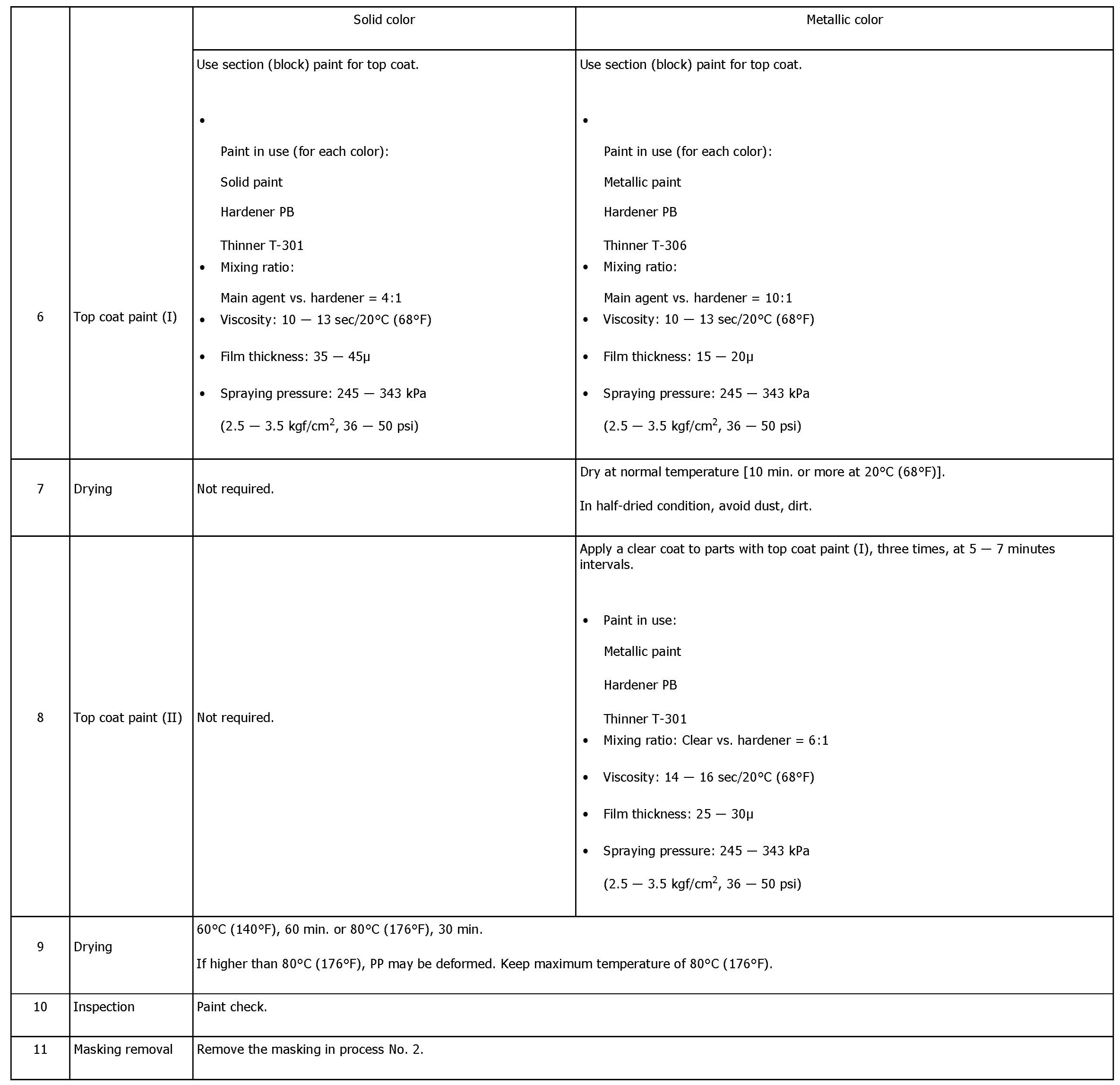 NOTE: All PP bumpers are provided with a grained surface, and if the surface is damaged, it cannot normally be restored to its former condition. Damage limited to shallow scratches that cause only a change in the lustre of the base material or coating, can be almost fully restored. Before repairing a damaged area, explain this point to the customer and get an understanding about the matter. Repair methods are outlined below, based on a classification of the extent of damage.