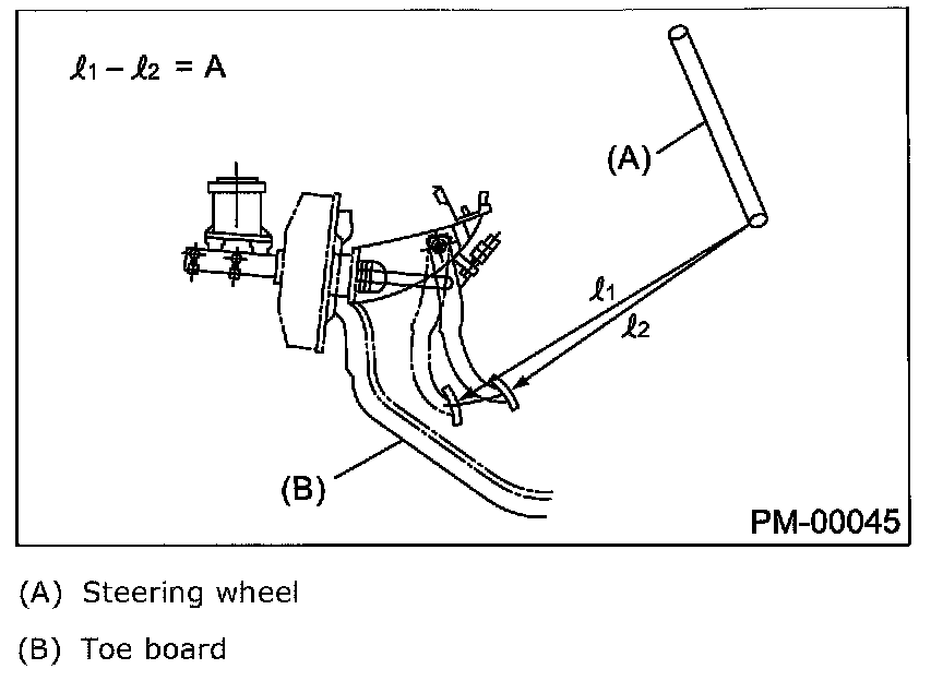 ^ While the engine is idling, depress the brake pedal with a 490 N (50 kgf, 110 lb) load and measure the distance between brake pedal and steering wheel. With the brake pedal released, measure the distance between pedal and steering wheel again. The difference between the two measurements must be less than specified value. If the distance is more than specified, there is possibility of air inside the hydraulic unit.