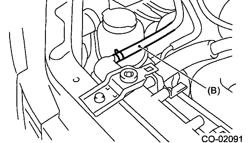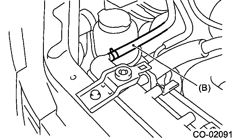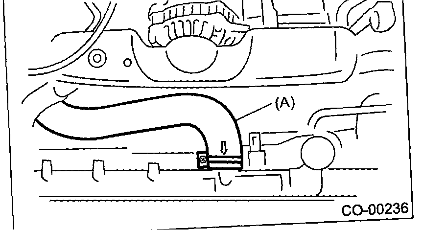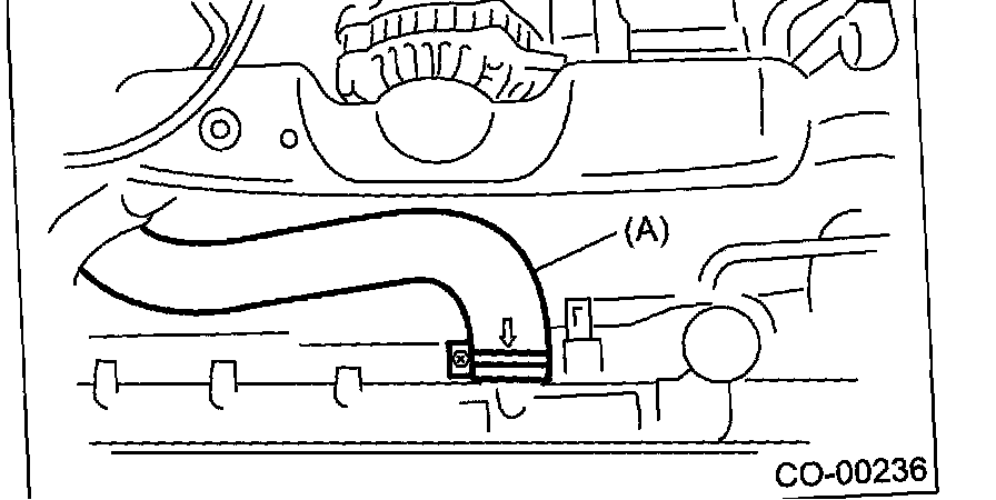 14. Disconnect the radiator inlet hose (A) and water tank hose (B) from radiator.
