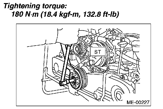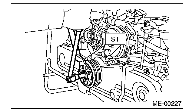 2. Remove the crank pulley bolt. To lock the crankshaft, use ST.