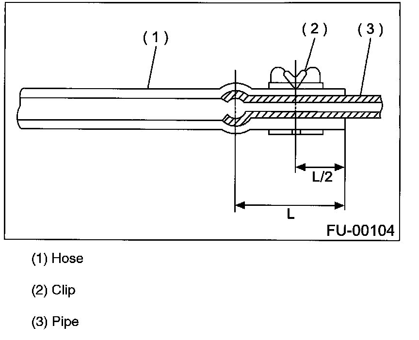 Insert the evaporation hose (B) approximately 25 to 30 mm (0.98 to 1.18 in) into the lower end of evaporation pipe and hold the clip.
