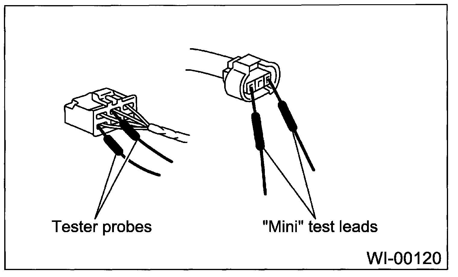 When checking continuity between connector terminals, or measuring the voltage across the terminal and ground, always contact tester probe(s) on terminals from the wiring connection side. If the probe is too thick to gain access to the terminal, use "mini" test leads.