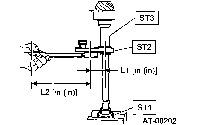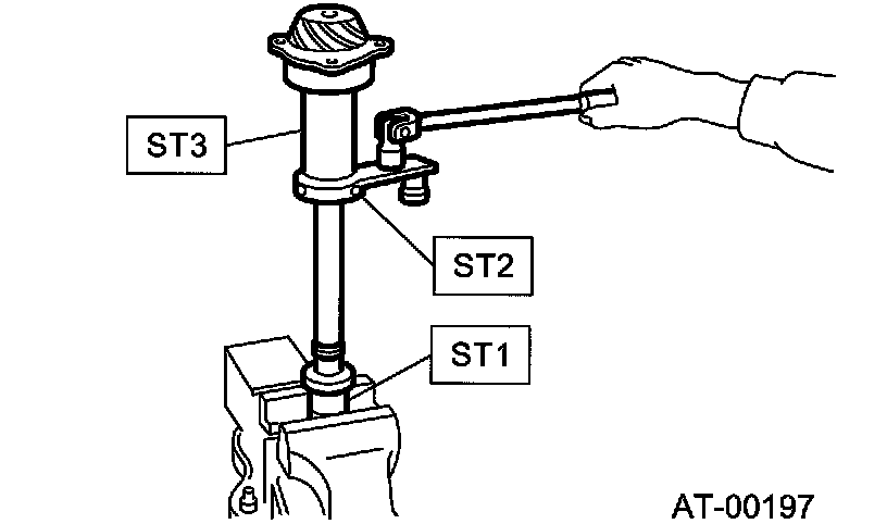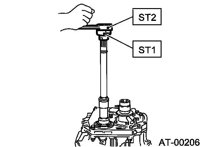Straighten the staked portion of the lock nut, and remove the lock nut while locking the rear spline portion of the shaft with ST1 and ST2. Then pull off the drive pinion collar.
