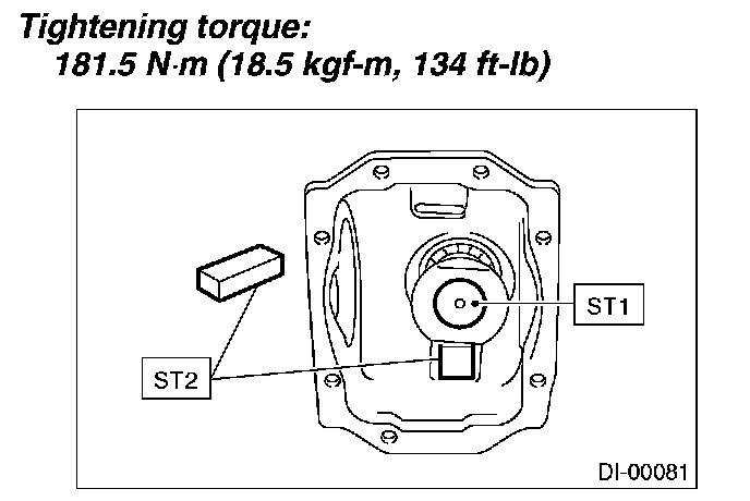 (4) Then install the preload adjusting spacer and washer, front bearing cone, ST2, companion flange, and washer and drive pinion nut.