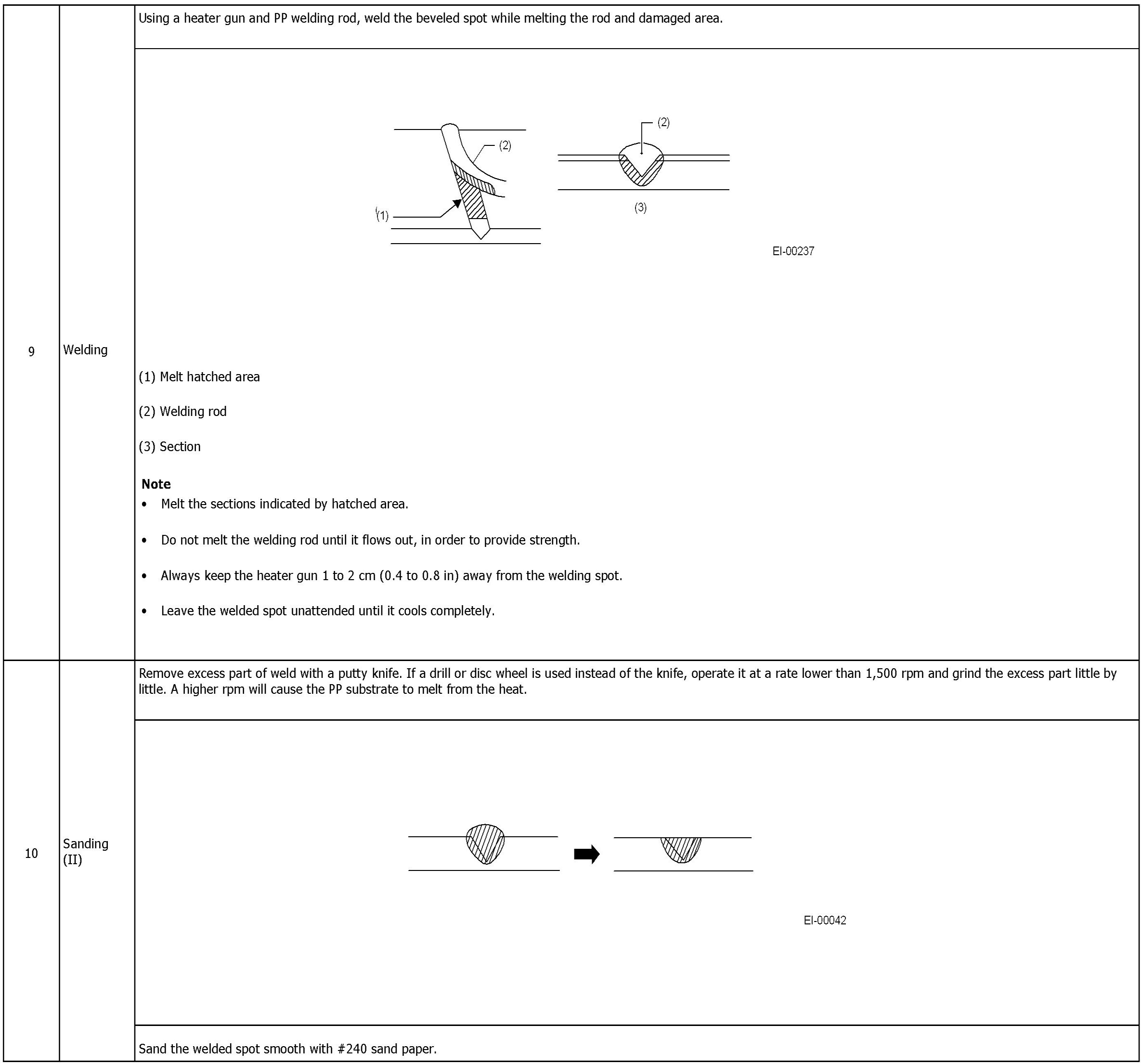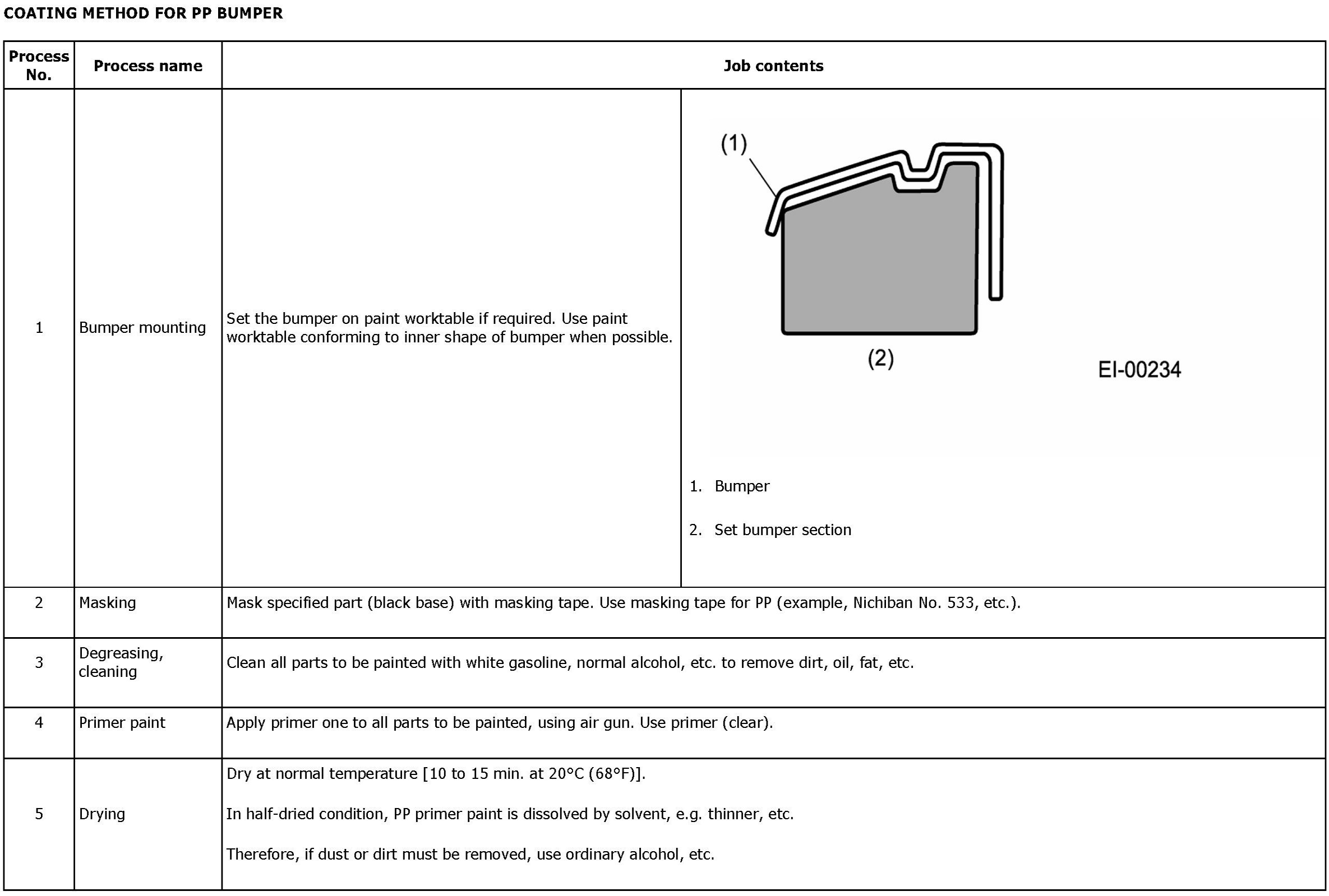 NOTE: All PP bumpers are provided with a grained surface, and if the surface is damaged, it cannot normally be restored to its former condition. Damage limited to shallow scratches that cause only a change in the lustre of the base material or coating, can be almost fully restored. Before repairing a damaged area, explain this point to the customer and get an understanding about the matter. Repair methods are outlined below, based on a classification of the extent of damage.