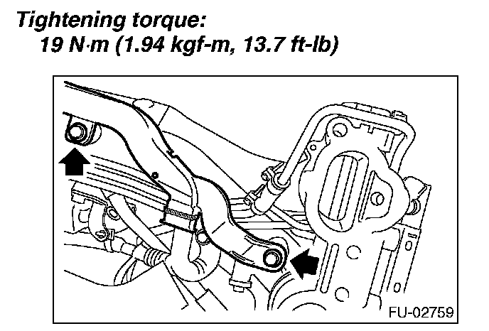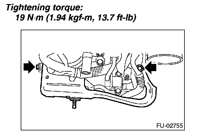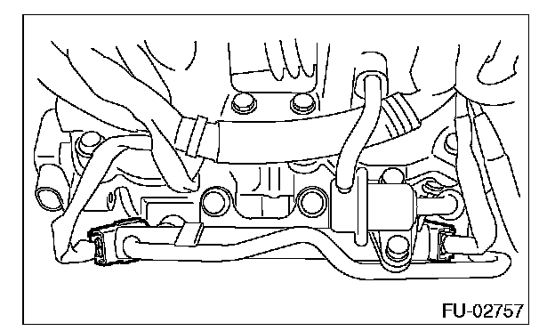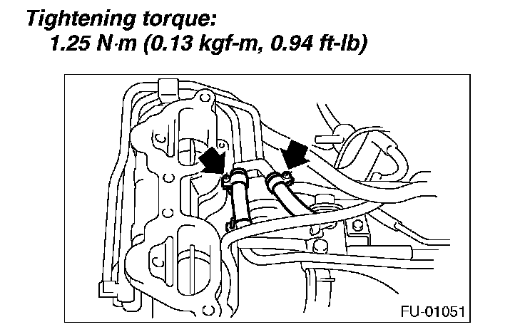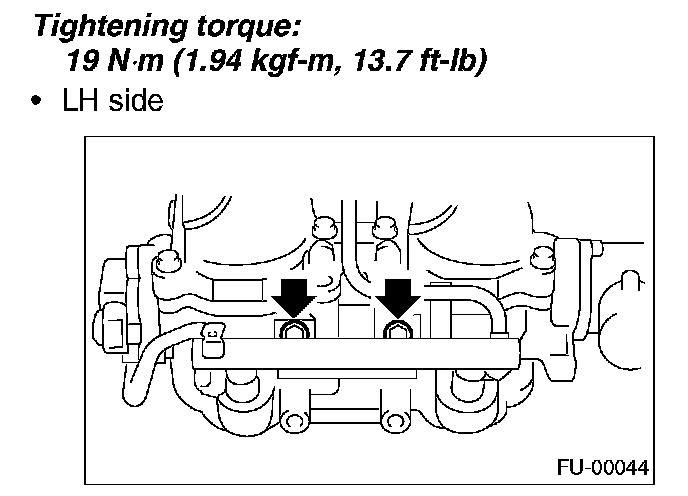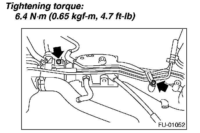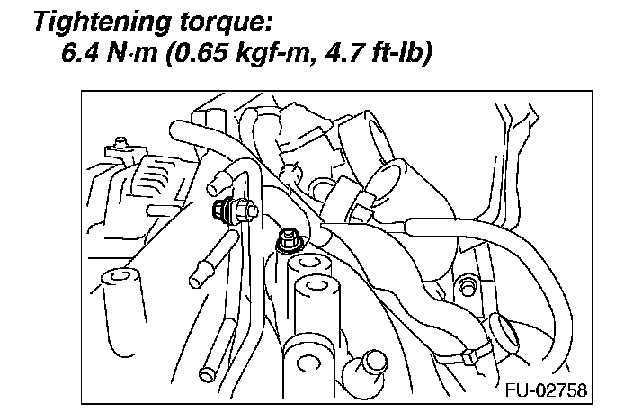 12. Tighten the two bolts which install the fuel injector pipes on the left side of intake manifold.