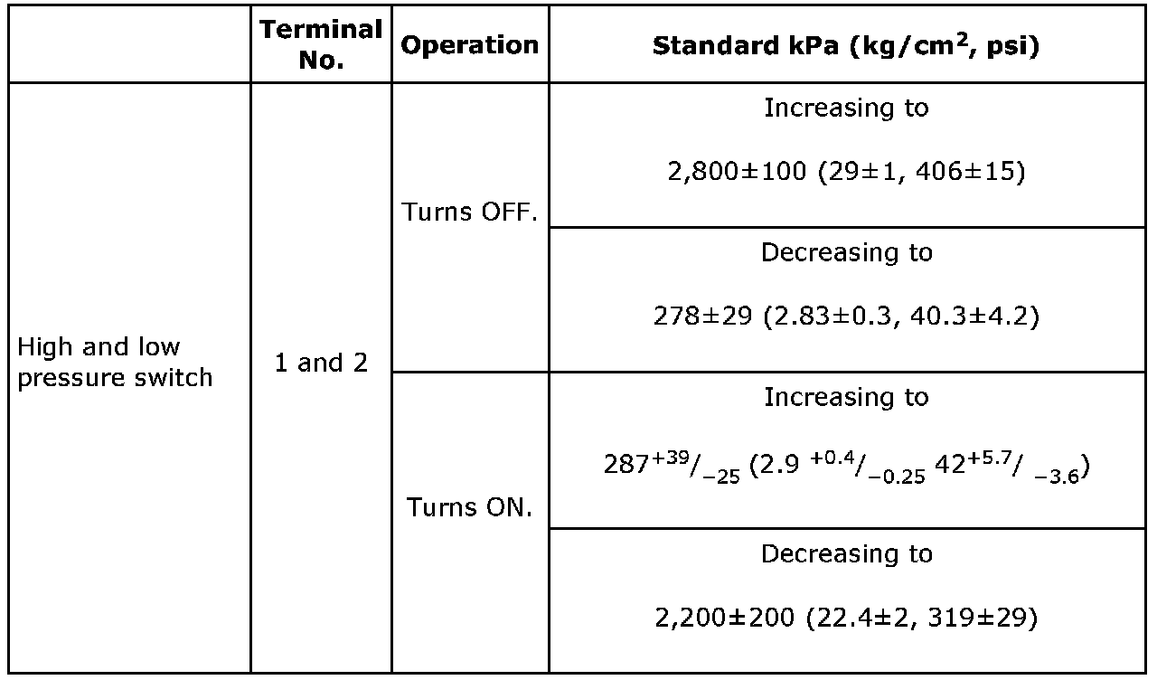Remove the pressure switch harness connector. Using a circuit tester, inspect the ON-OFF operation of pressure switch.