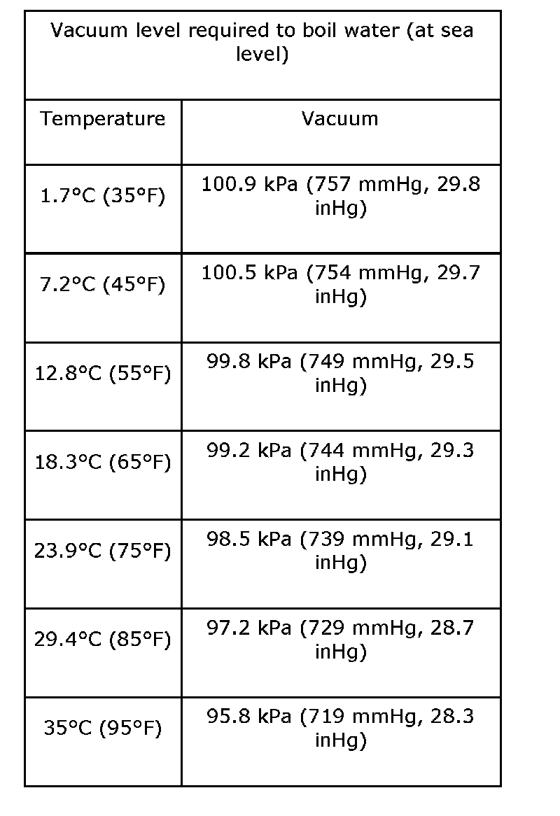 - The list shows the vacuum values necessary to boil water in various temperature. In addition, the vacuum levels indicated on the gauge are approx. 3.3 kPa (25 mmHg, 0.98 inHg) lower than those measured at 304.8 m (1,000 ft) above sea level.