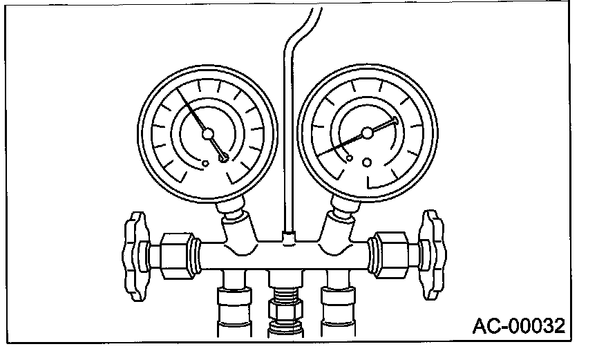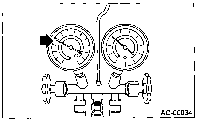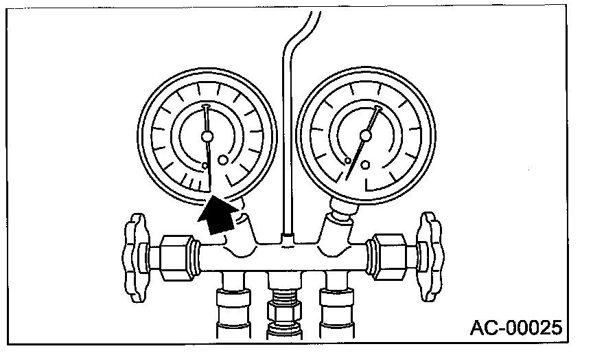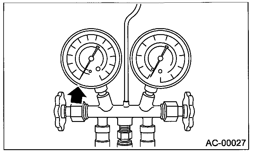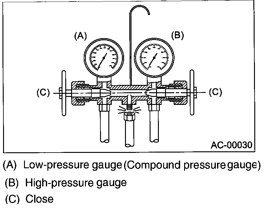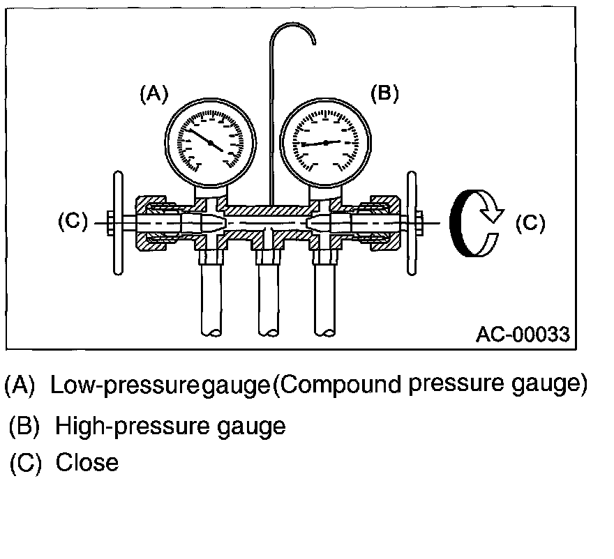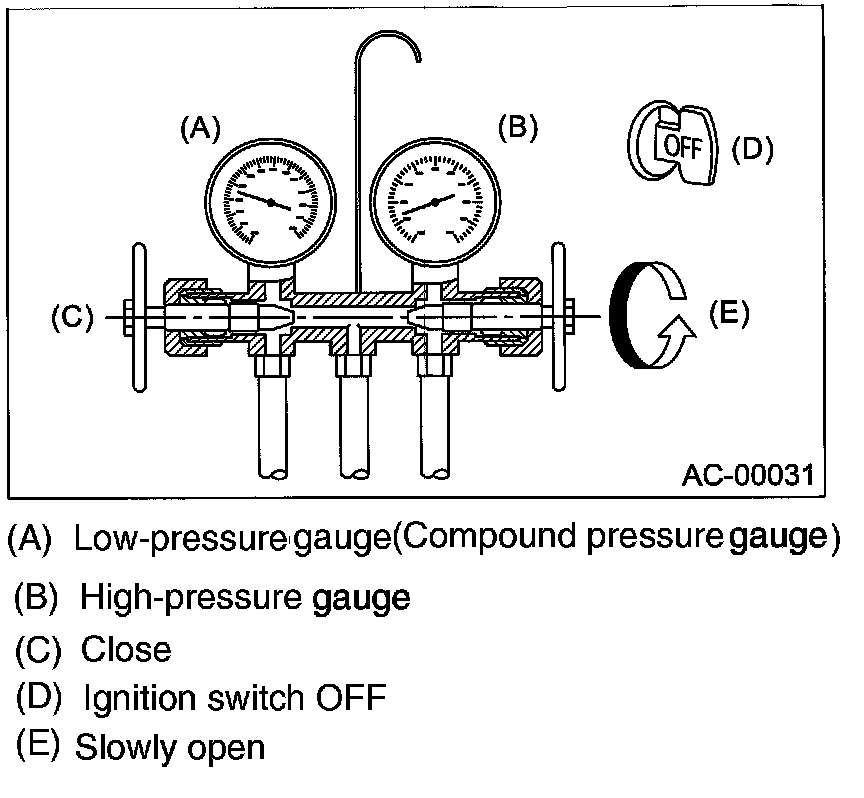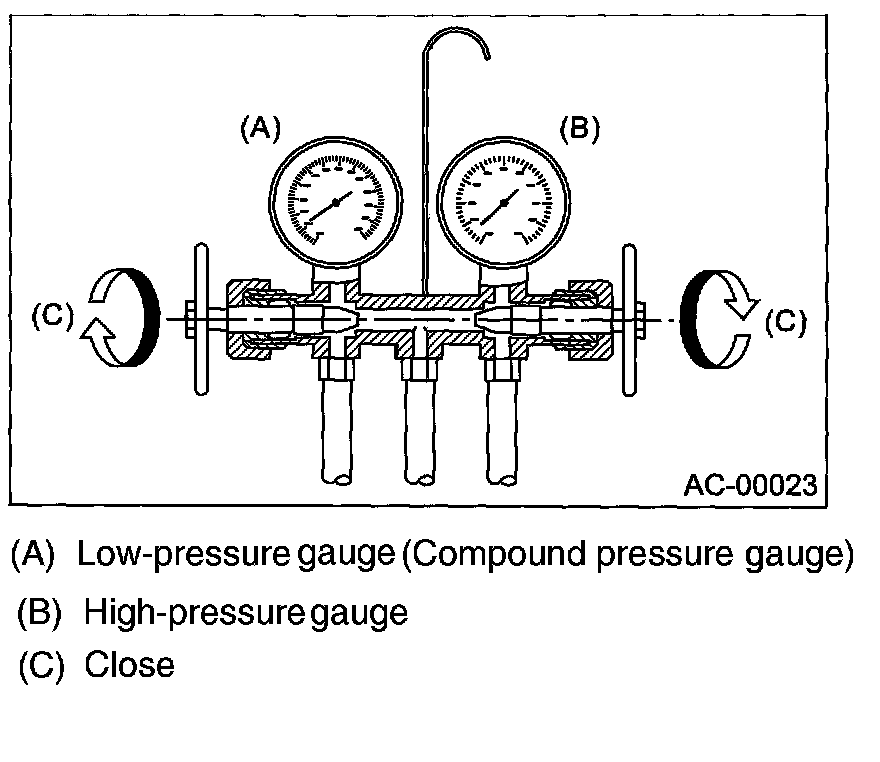 Confirm that both the low-/high-pressure valves can be closed. Start the engine with the A/C switch OFF.