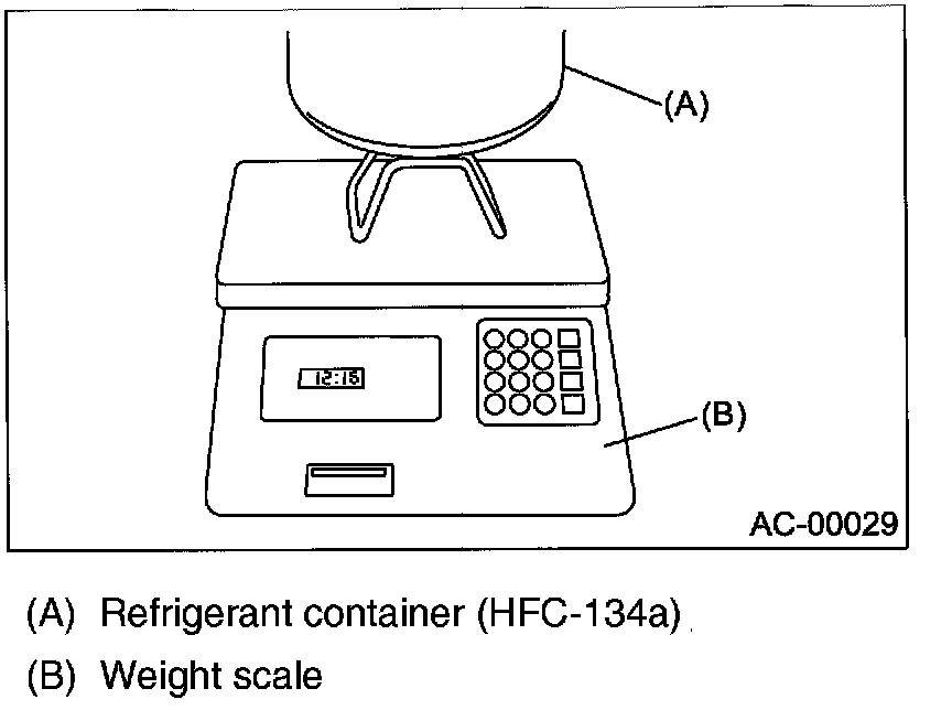 When a 13.6 kg (30 lb) refrigerant container is used, measure the refrigerant amount in use using a weighting scale.