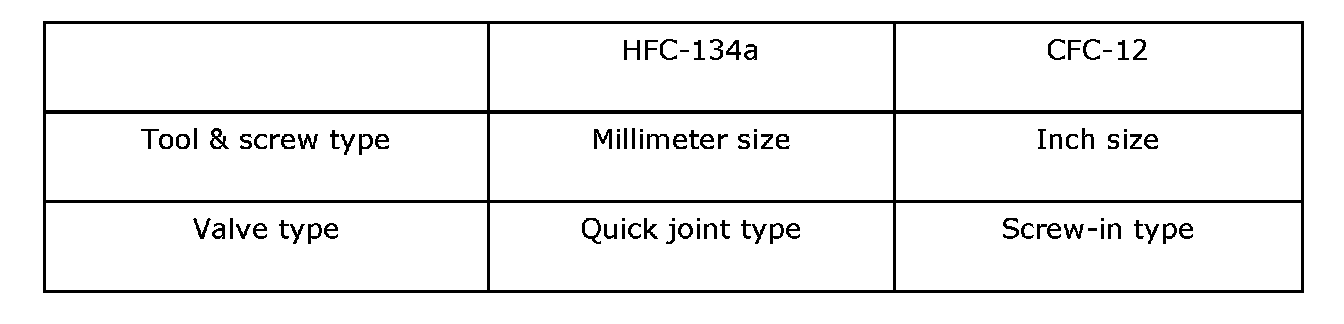 - In order to help prevent mixing HFC-134a and CFC-12 parts and liquid, the tool and screw type and the type of service valves used are different. The gas leak detectors for the HFC-134a and CFC-12 systems must also not be interchanged.