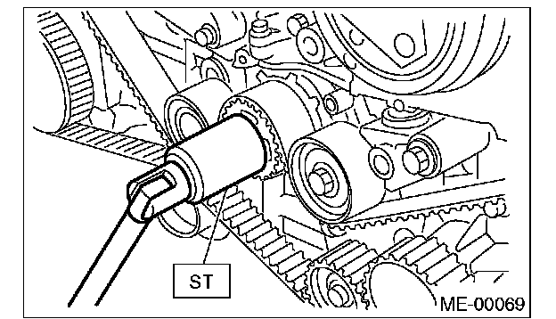 IMPORTANT: After the timing belt has been removed, never rotate the intake and exhaust cam sprocket. If the cam sprockets are rotated, the intake and exhaust valve heads strike together and valve stems are bent.