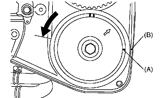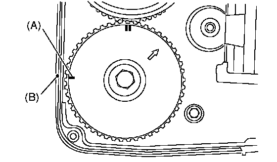 7. Align the single line mark (A) on intake cam sprocket (LH) with notch (B) on timing belt cover by turning the sprocket clockwise (as viewed from front of engine).