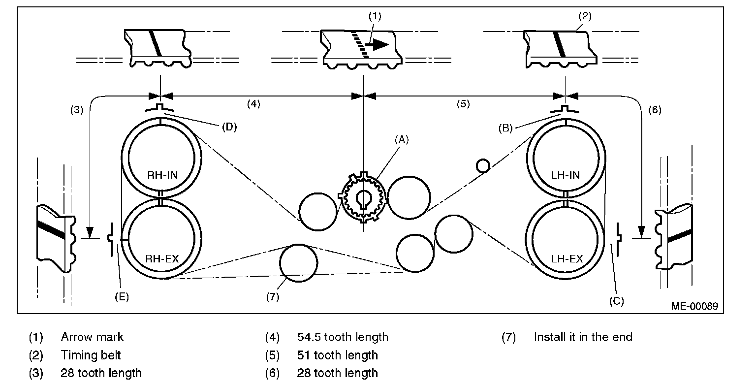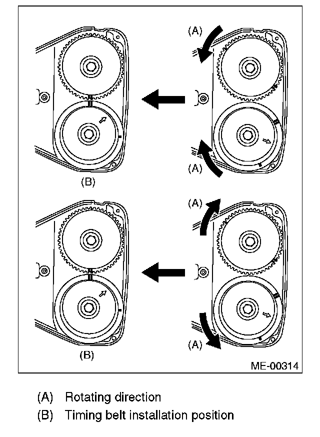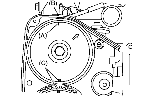 5. If the alignment mark and/or arrow mark (which indicates rotation direction) on timing belt fade away, put new marks before removing the timing belt as follows: