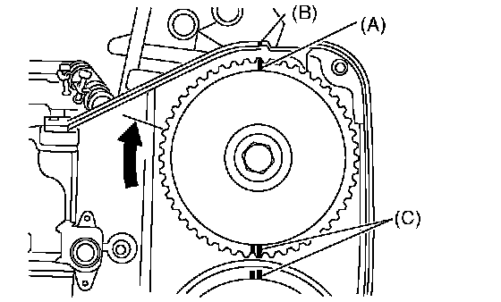 ^ Align the alignment mark on timing belt with marks on sprockets in alphabetical order shown in the figure. While aligning marks, position the timing belt properly.