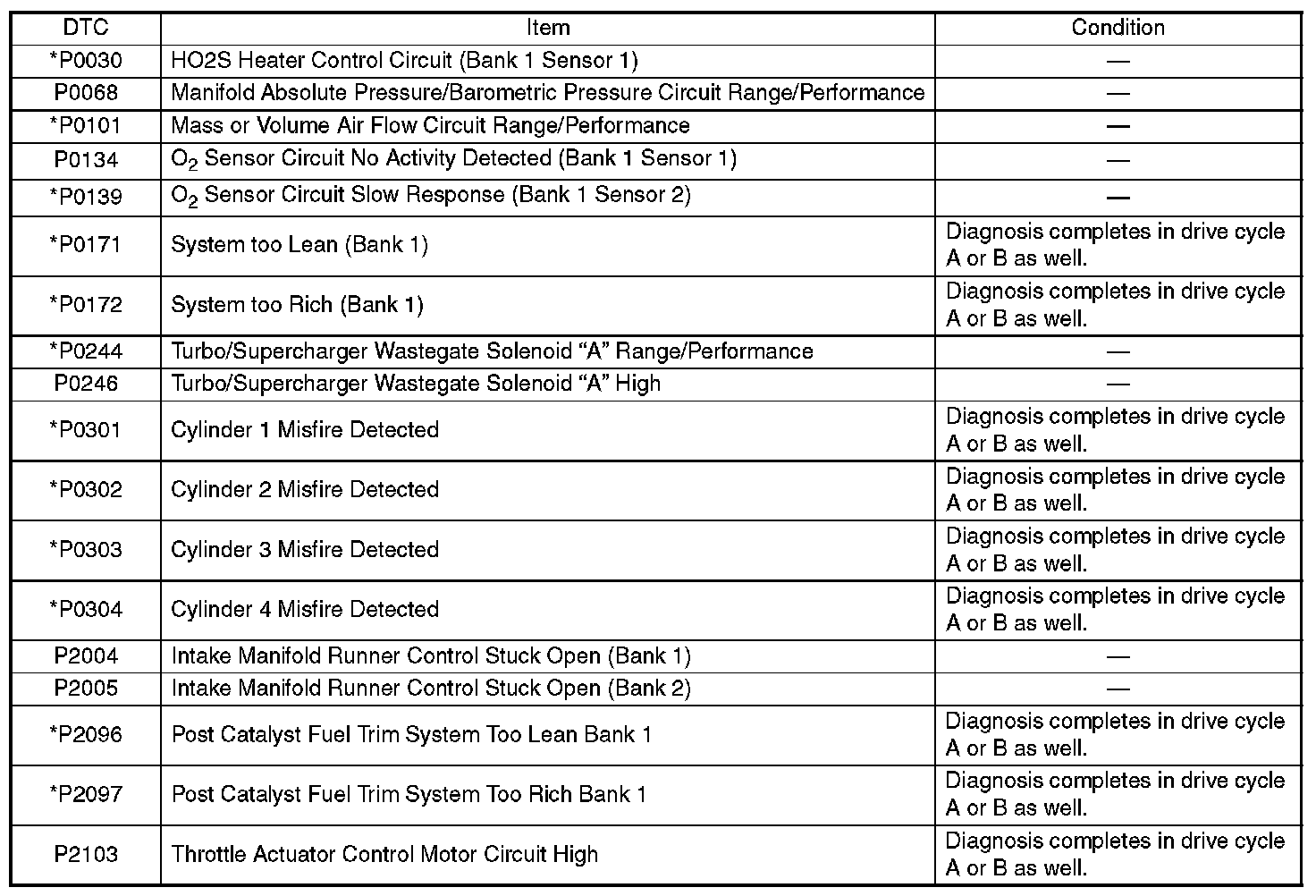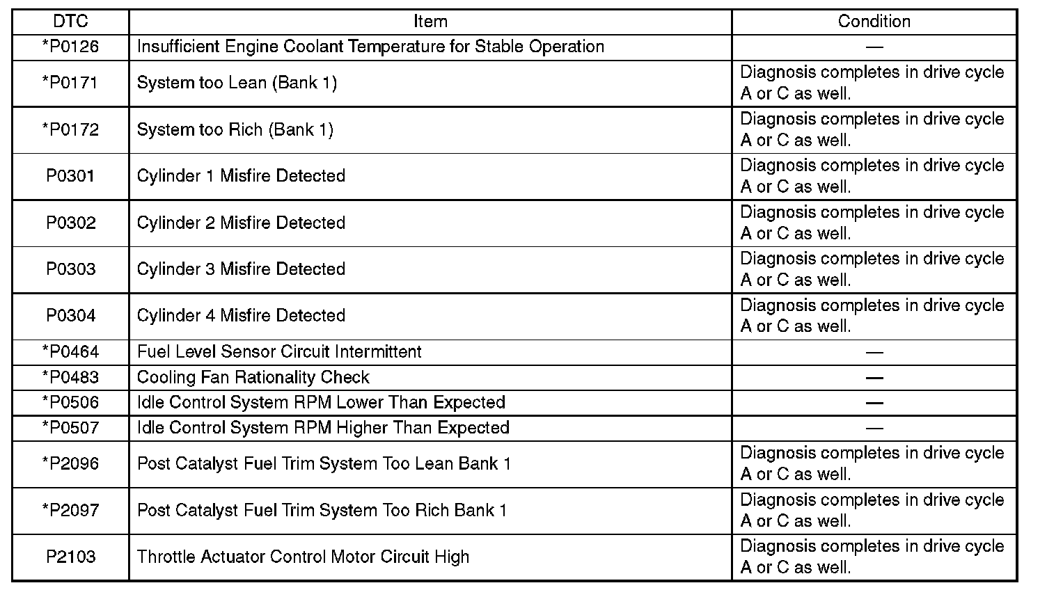 - Carry out the diagnosis which is marked* on DTC twice, then, after finishing first diagnosis, stop the engine and do second time at the same condition.