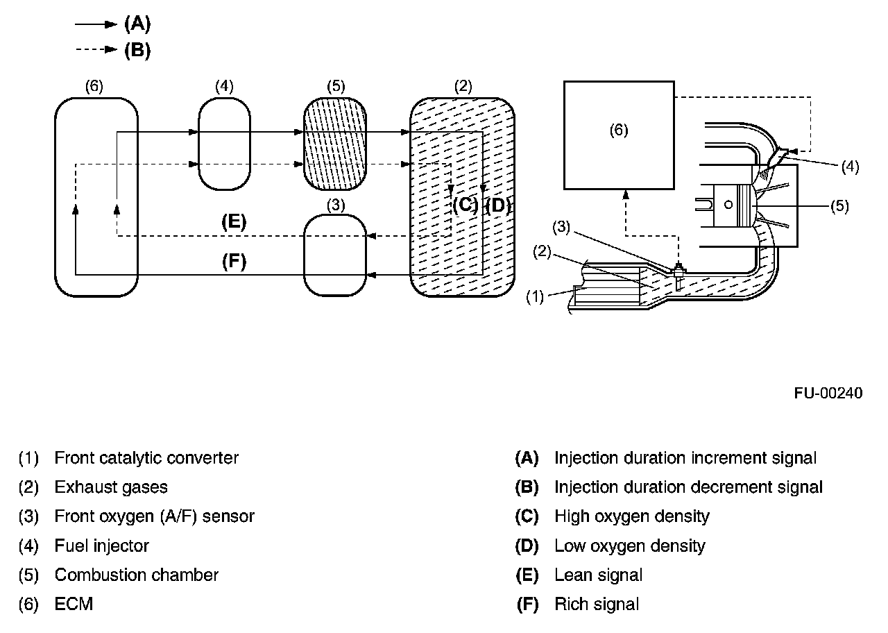 ^ In the air-fuel ratio feedback control, the ECM calculates the necessary amount of correction based on data from the front oxygen (A/F) sensor and adds the result to the basic duration (which is stored in the ECMs memory for each condition defined by the engine speed and various loads.)