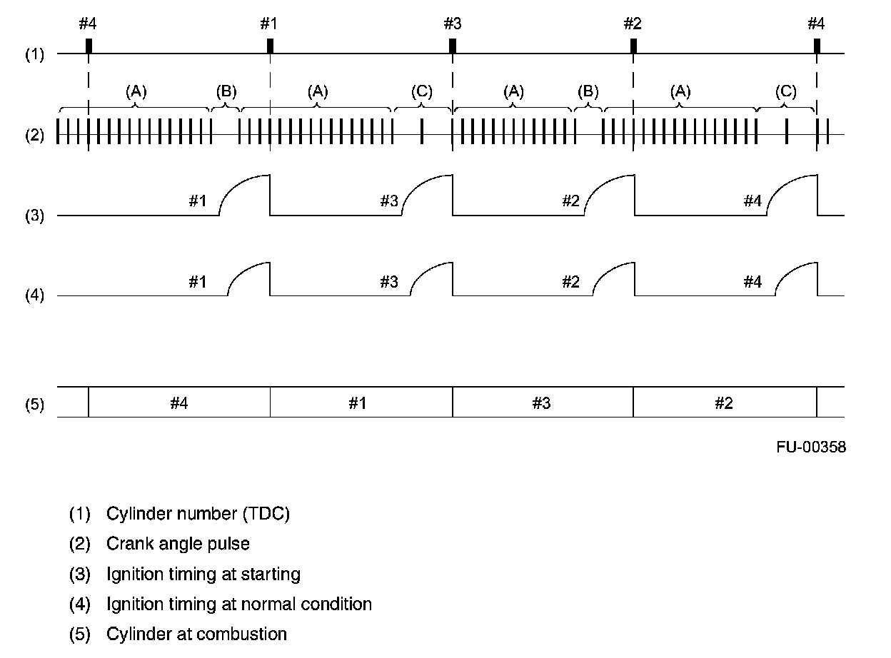 ^ The ECM judges that the No.1 and No.2 cylinders are at TDC when it detects the range (B), and that the No.3 and No.4 cylinders are at TDC when it detects the range (C).