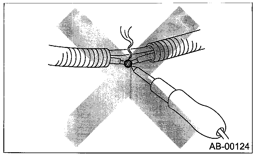 - If any damage, opening, or rust is found on the airbag system wire harness, do not attempt to repair using soldering equipment. Be sure to replace the faulty harness with a new genuine part.