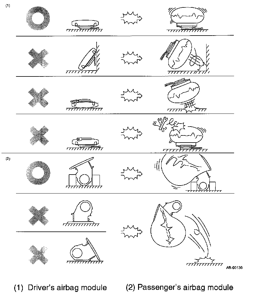 - When storing a removed airbag module, do not place any objects on it or pile airbag modules on top of each other. If the airbag inflates for some reason when it is placed with its pad side facing downward or under any object, a serious accident may result.