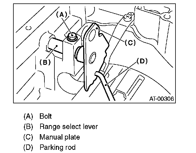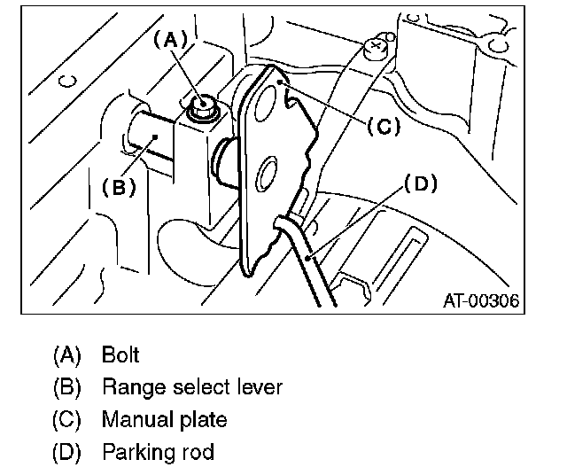 12. Remove bolt securing select lever, then remove select lever, manual plate and parking rod.
