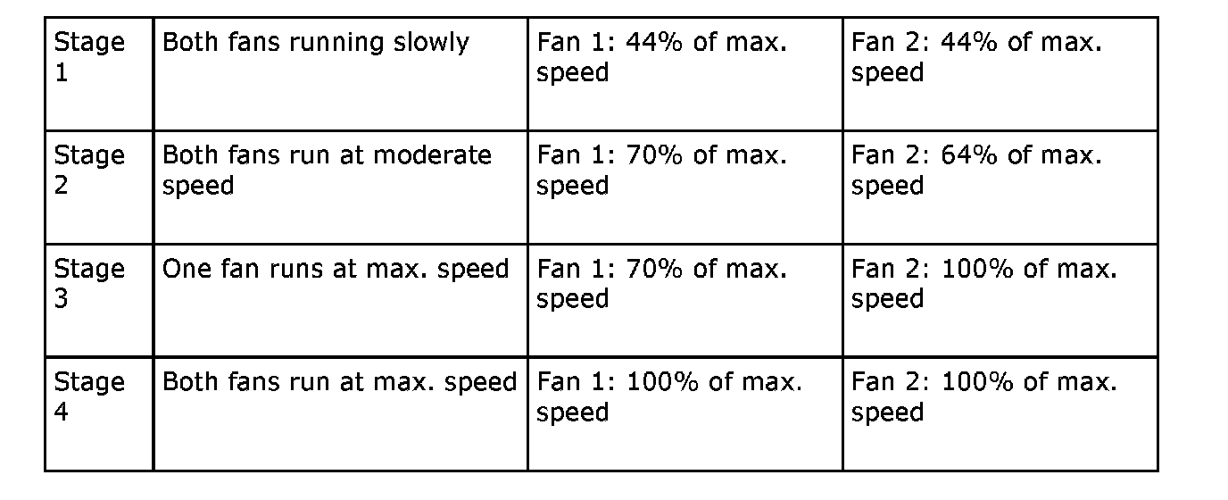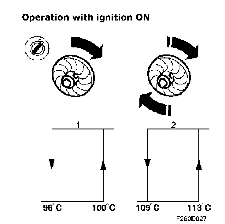 Fan speed 2 is engaged when the coolant temperature reaches 105°C and returns to fans speed 1 when the temperature has dropped to 101°C.
