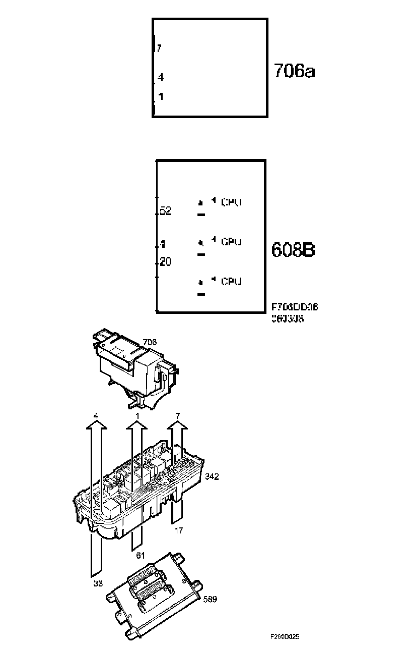 Radiator fan relay box (706) is supplied with +30 from UEC to pins 3 and 6, and is grounded to G30A from pins 5 and 2.