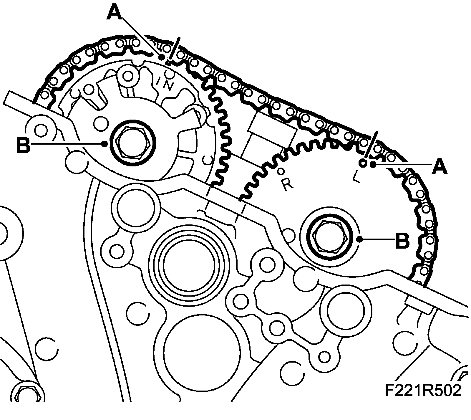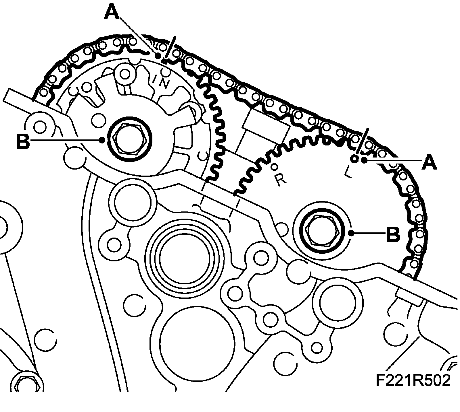 18. Loosen the torque on the bolts (B) holding the camshaft sprockets. Counterhold using an open spanner on the camshaft flats (do not remove the bolts).