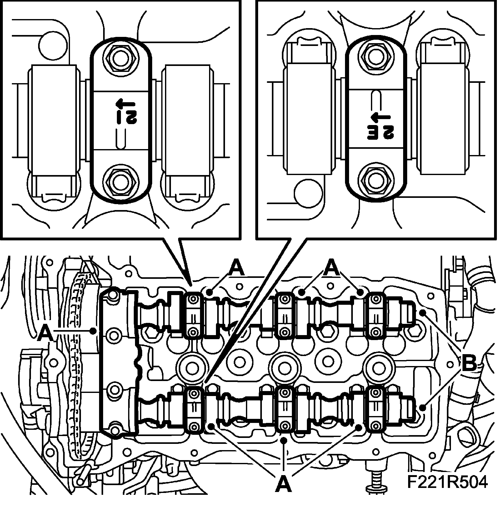 23. Remove the camshaft bearing caps by loosening the bolts in stages - 1/2 to 1 turn. It is important that the removal ends at the bearing cap where the tappets are loaded. Note the markings on the bearing caps when refitting to ensure that they are in the correct locations (A).