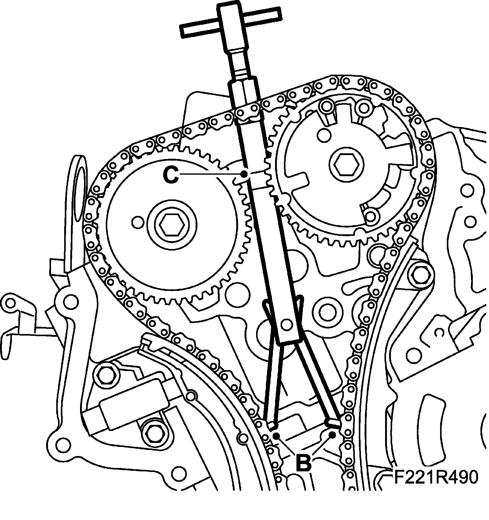 12. Fit EN-48313 Timing chain holding tool to the timing chain. Check that the tool grips the chain (B) securely and that the upper groove (B) of the tool aligns with the top of the cylinder head (the timing cover is removed in the illustration to better depict tool fitting).