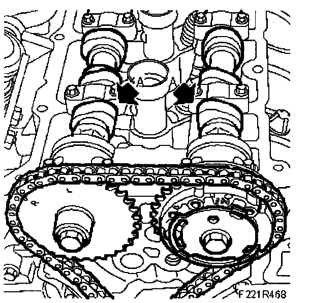 7. Remove the timing chain tensioner for the rear cylinder bank (A).