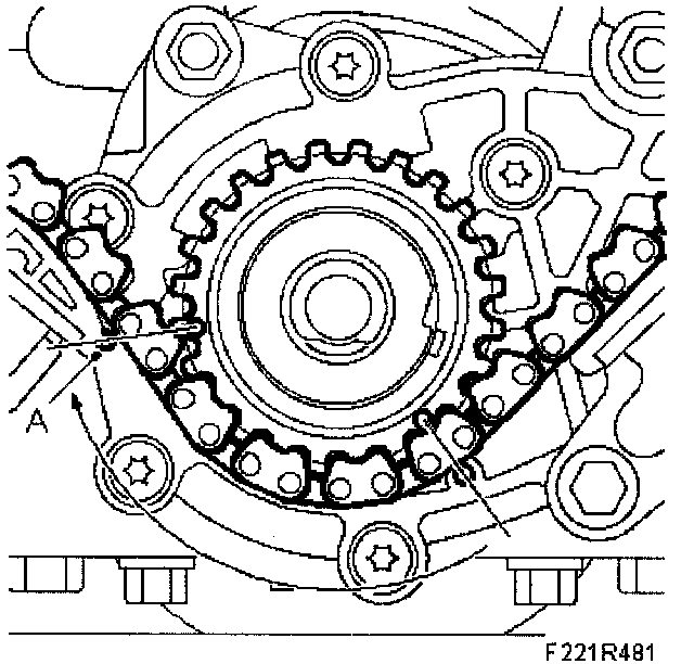 Rotate the crankshaft forward approx. 1/4 turn, approx. 1000 ATDC, so that the marking on the crankshaft sprocket is aligned with the marking on the oil pump (A).