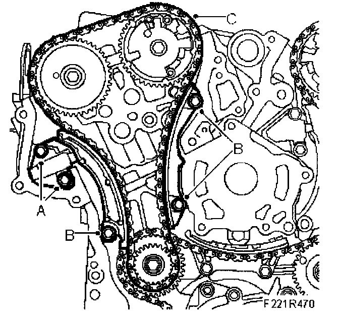 10. Position the chain (C) on the camshaft sprocket so that the silver links align with the markings on the camshaft sprocket. For the sprocket of the rear cylinder bank, the R-mark is to be used for alignment.