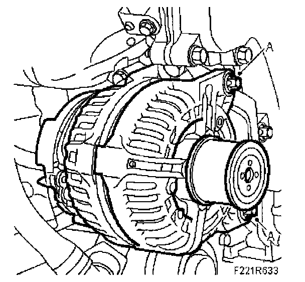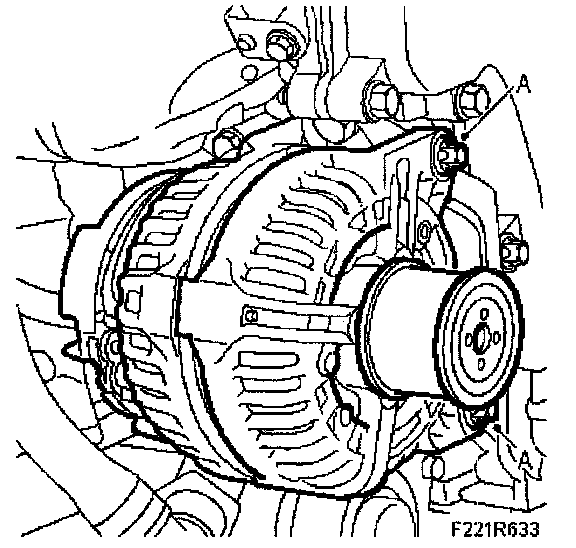 4. Tighten the bolts (B) slightly so that the alternator bracket makes contact with the engine block. Fit and tighten the upper bolt (A). Tighten the bolts (B).