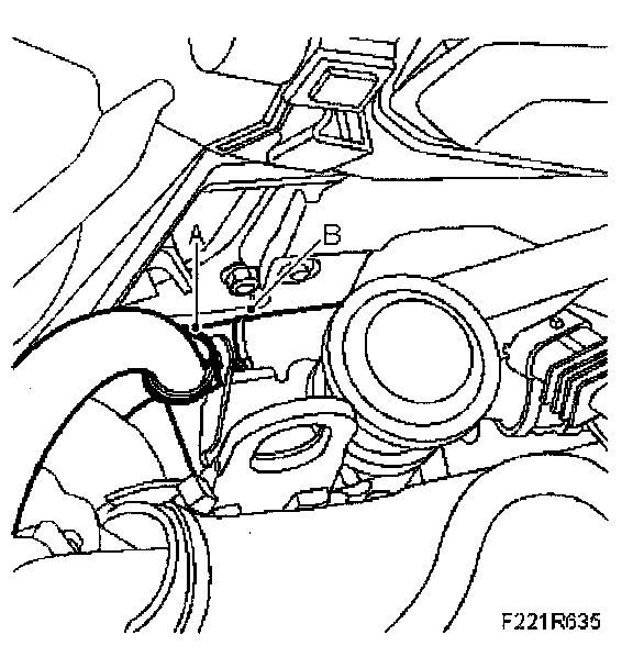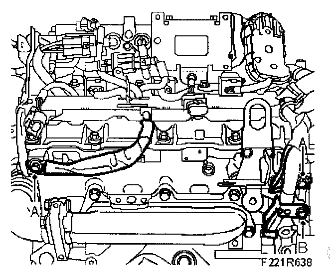17. Remove the power steering hose (A) and coolant hose (B) from the bracket on the cylinder head.