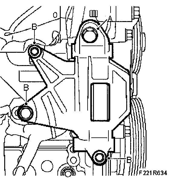 6. Fit the alternator bolts (B). Pry the engine slightly to the left if necessary.