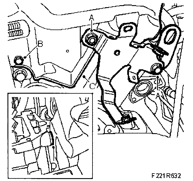 11. Remove the bolt (B), move aside the heat shield (C) slightly and keep track of any spacer washer (D).